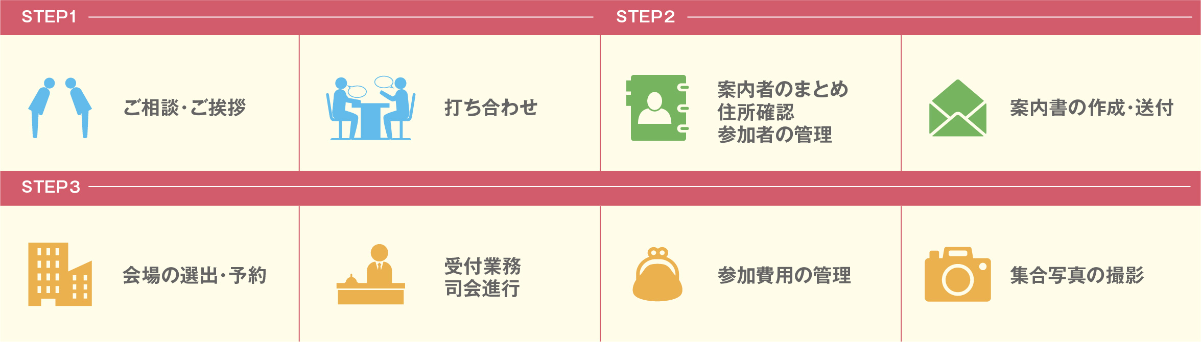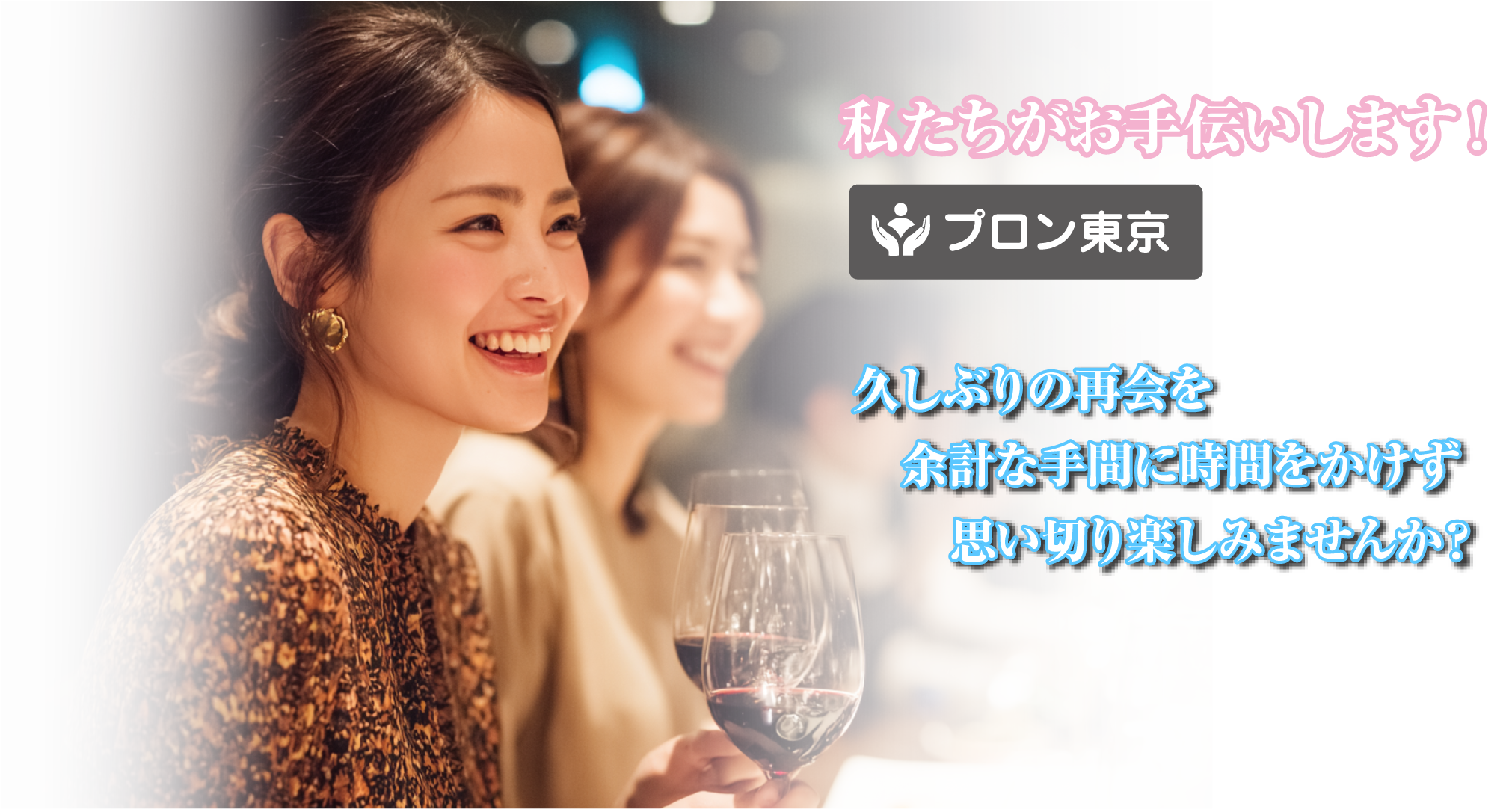 同窓会は事前準備が大変です。恩師や同窓生への案内状の作成、所在不明者の確認、会場の手配、料理内容や飲み物などの打合せ、参加者の確認作業、当日の司会・進行・受付など…発起人の方は非常に準備する項目が多いと思います。プロン東京ならば、そんな幹事様を徹底サポート出来ます。面倒な事前準備から当日のフォローまで親身にご対応させていただきますので、幹事様はご出席者の皆様と一緒に感動の再会をお楽しみください。